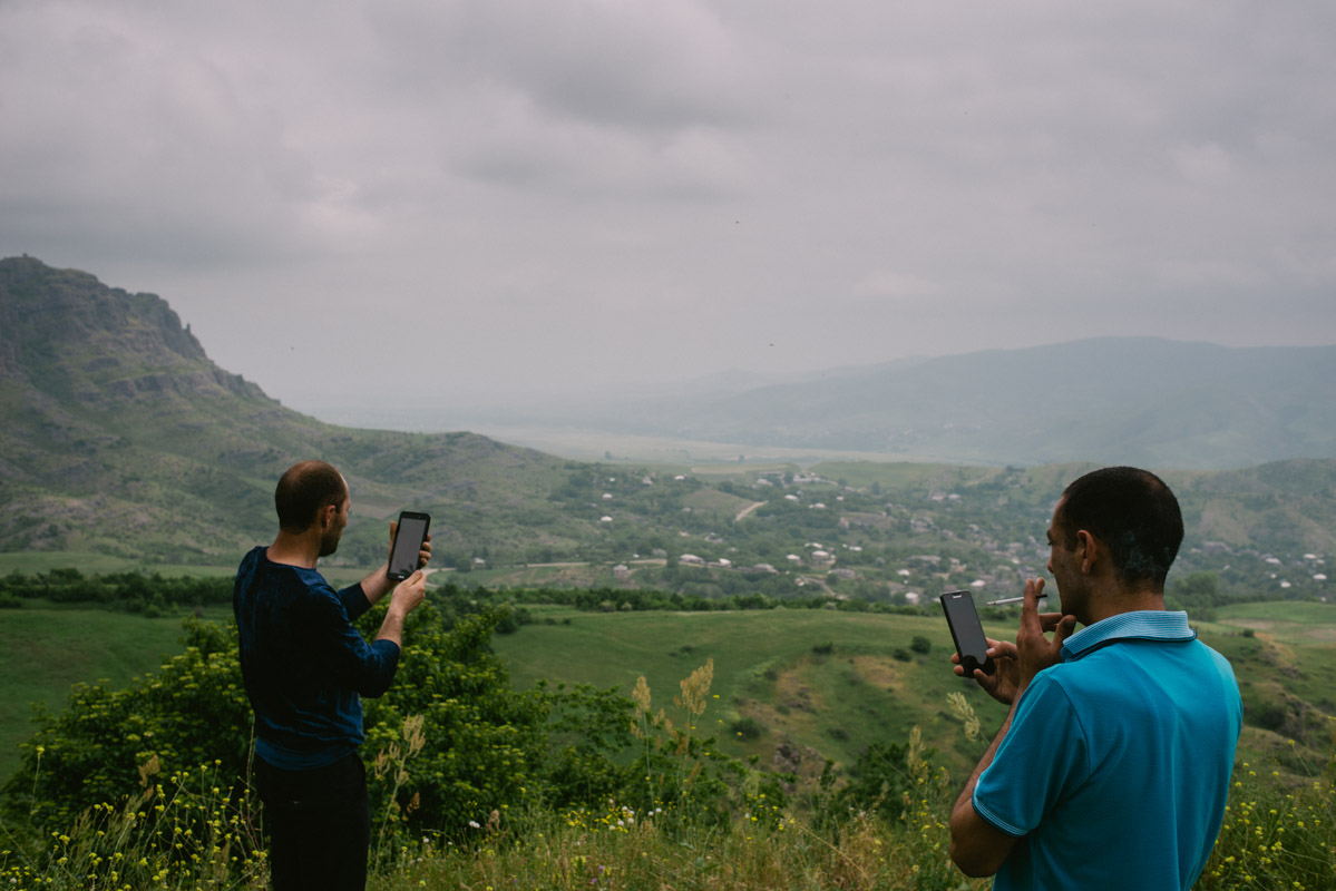 Two Armenians photograph the village of Aygepar in the region of Tavush, Armenia. The houses are near the closed border with Azerbaijan where sniper positions face each other on both sides. Violations of the 1994 ceasefire are frequent along the main border between the two countries. Most of the casualties are soldiers but villagers and farm animals are also targeted.