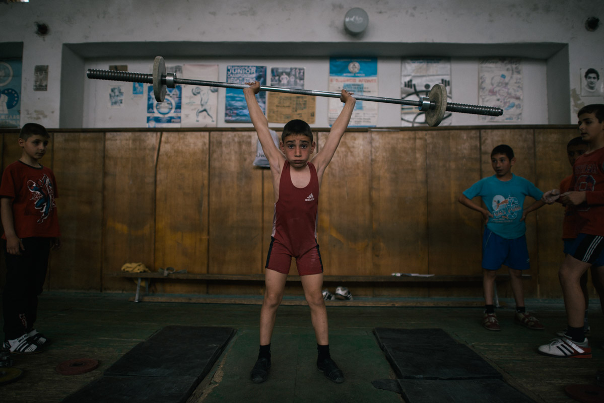 A child trains weightlifting in the village of Geghakert, Armenia. The run-down gym produced several world champions but many athletes choose to migrate to other countries due to the dire economical situation of Armenia. After 1991, the country remained geographically isolated, cut off from Azerbaijan and Turkey, and industry formerly dependent on the Soviet Union collapsed.