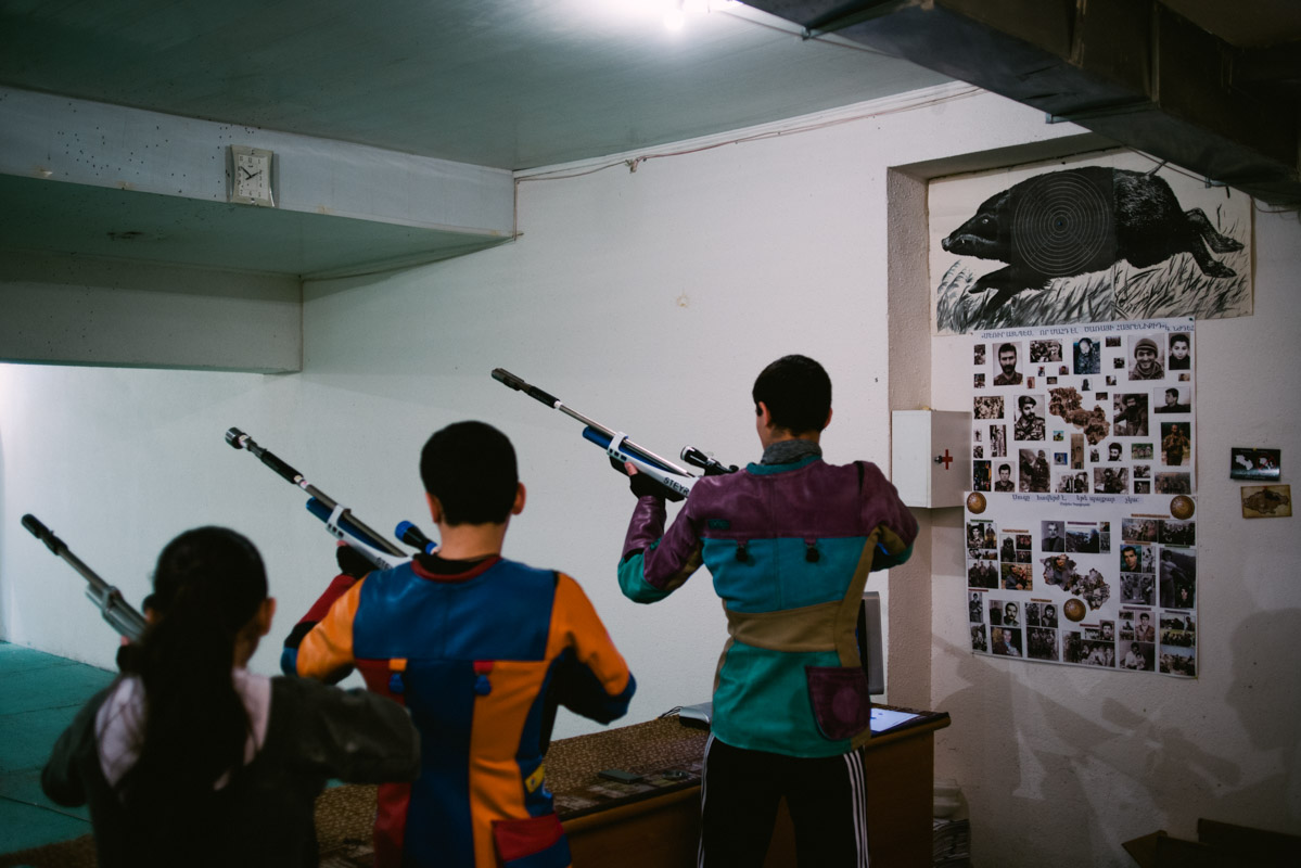 Armenian shooters train at a range in Yerevan underneath a poster of Nagorno-Karabakh’s war veterans. The region is currently a de-facto independent state, not recognised by any countries in the world and supported by Armenia. The territory is considered by the international community as part of Azerbaijan.