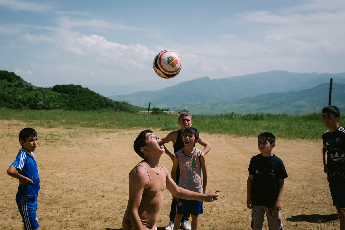 Armenian children in the football ground by the village of Voskevan near the border with Azerbaijan. The ground is in the shadow of sniper positions and the children have to consult with their parents, or the military, to play at times when there is calm on the frontline.