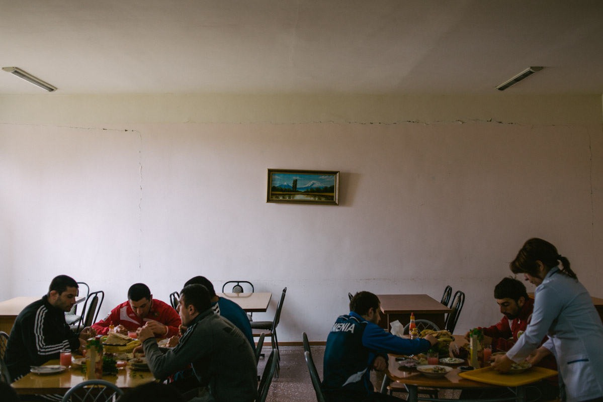 Lunch of the Armenian National Sambo Team in a training facility in Abovyan, Armenia. Sambo, a mixture of judo and wrestling is a common sport in post-Soviet countries and has its origins in the Red Army.