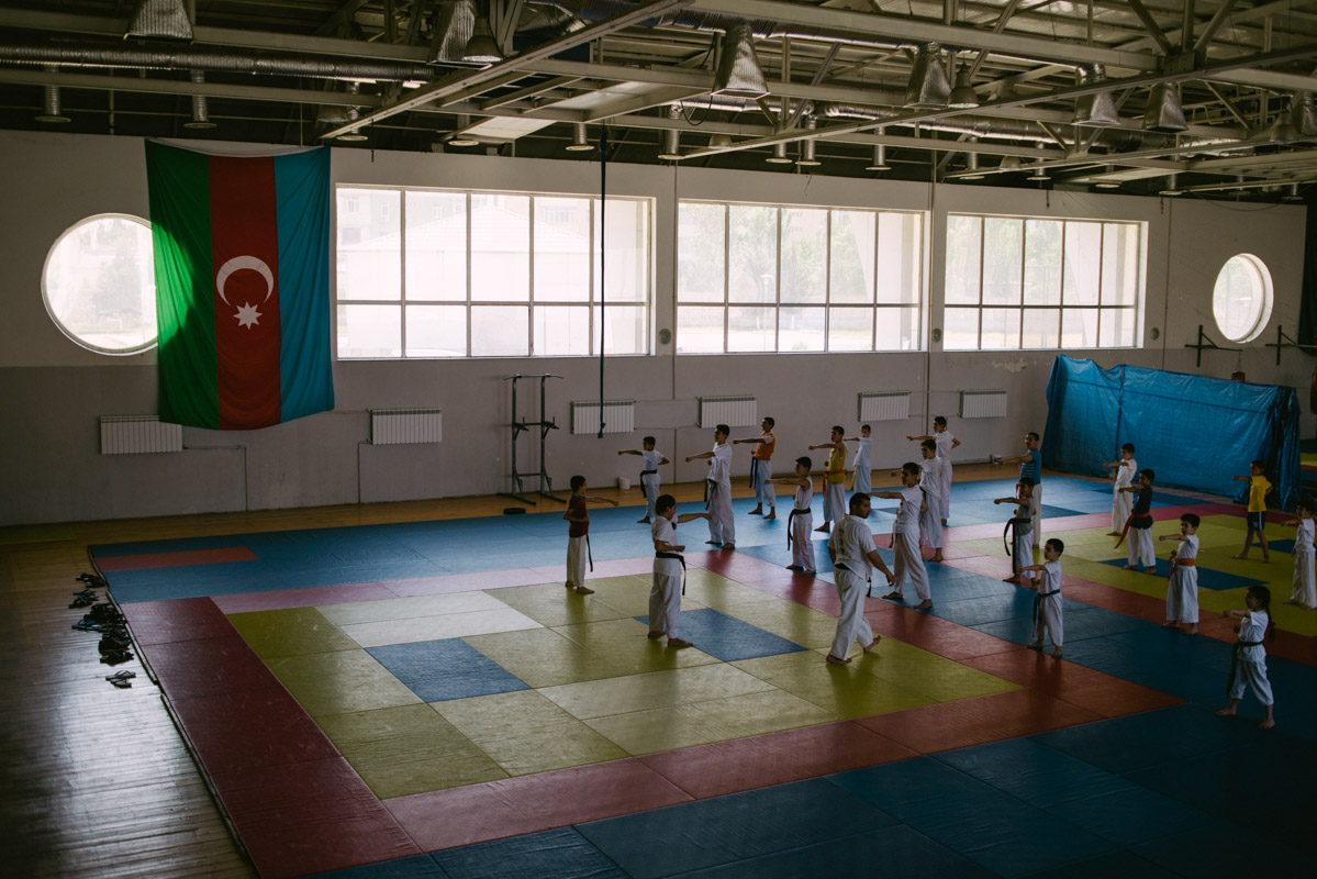 Children during a lesson of Karate in the freshly renovated Heydar Alyev Sport Complex in Sumgait. In 1988, as Soviet Union was cracking apart, Sumgait was the theatre of one the very first post-soviet ethnic conflicts between Armenians and Azerbaijanis. 32 people were killed and nearly all of the 14,000 Armenian residents fled.
