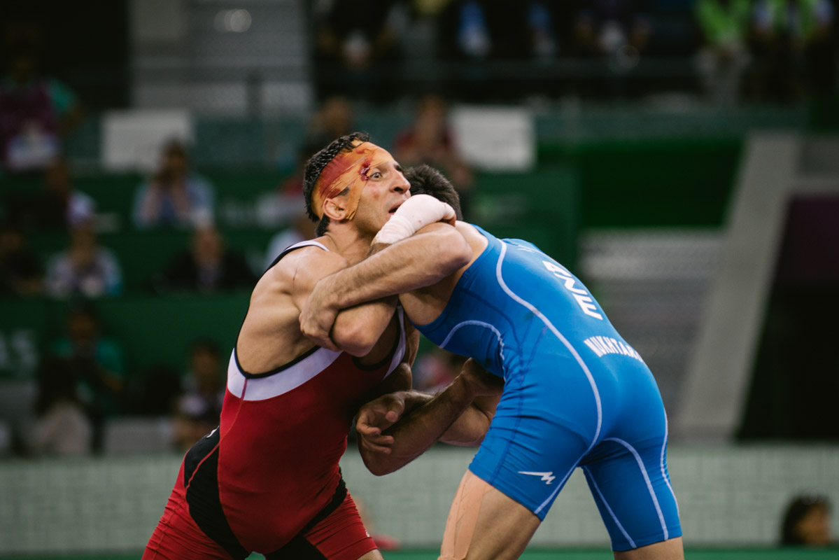 The armenian wrestler Roman Amuyan fight against the azerbaijani Elman Mukhtarov for the bronze medal in Heydar Alyiev Arena in Baku.
