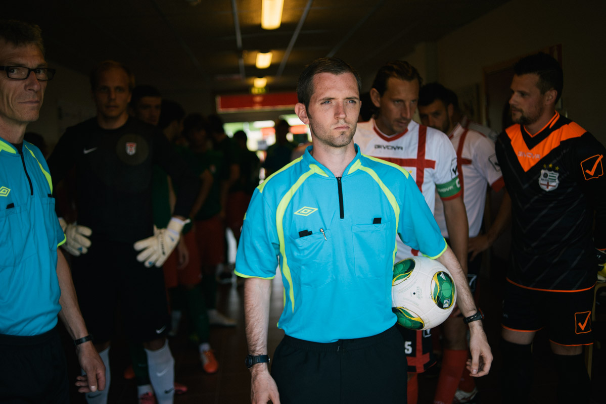 Referees and the teams of Abkhazia and Padania line up before the match. Abkhazia is a disputed territory claimed by the Republic of Georgia, while Padania is the ideal region of northern Italy. Lega Lombarda, a political party that supports the federalisation of Italy, created the concept of Padania during the 1990s.