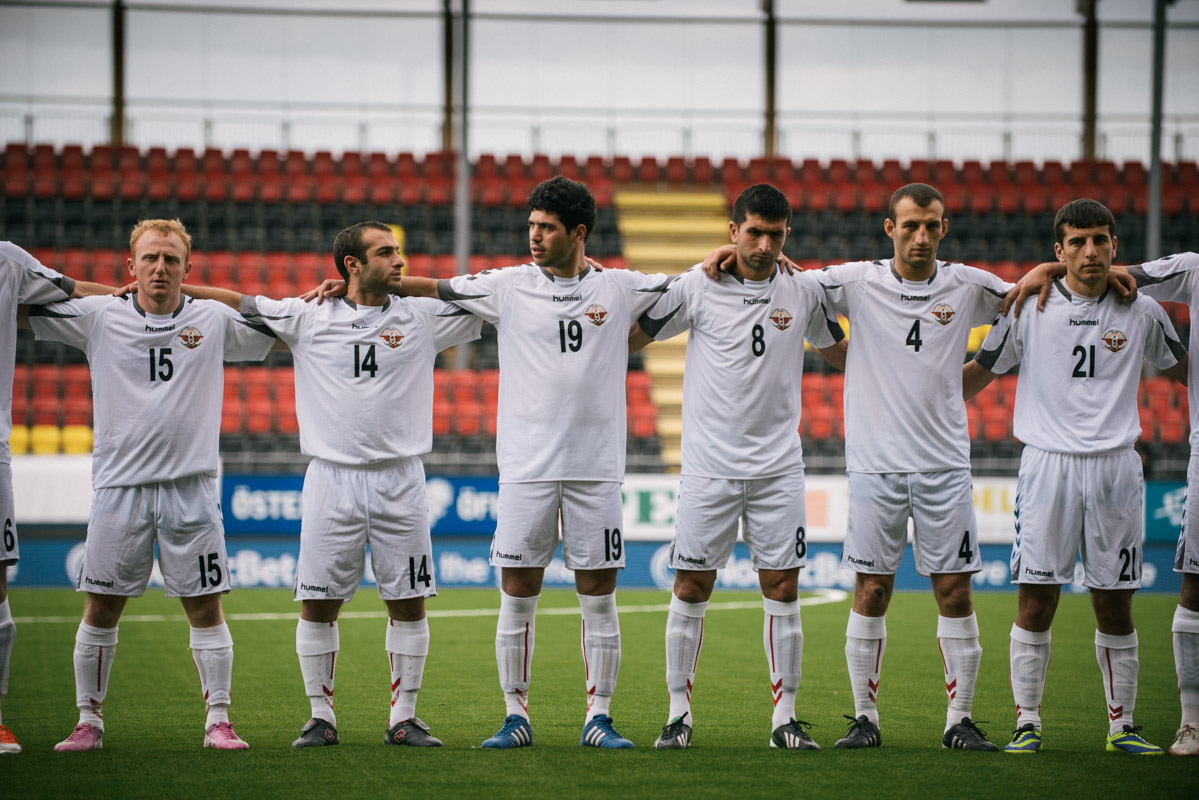 The Nagorno-Karabakh team stands during the playing of the national anthems before a game. Although the football federation of Azerbaijan requested that CONIFA prevent the breakaway republic from participating, CONIFA declined to do so.