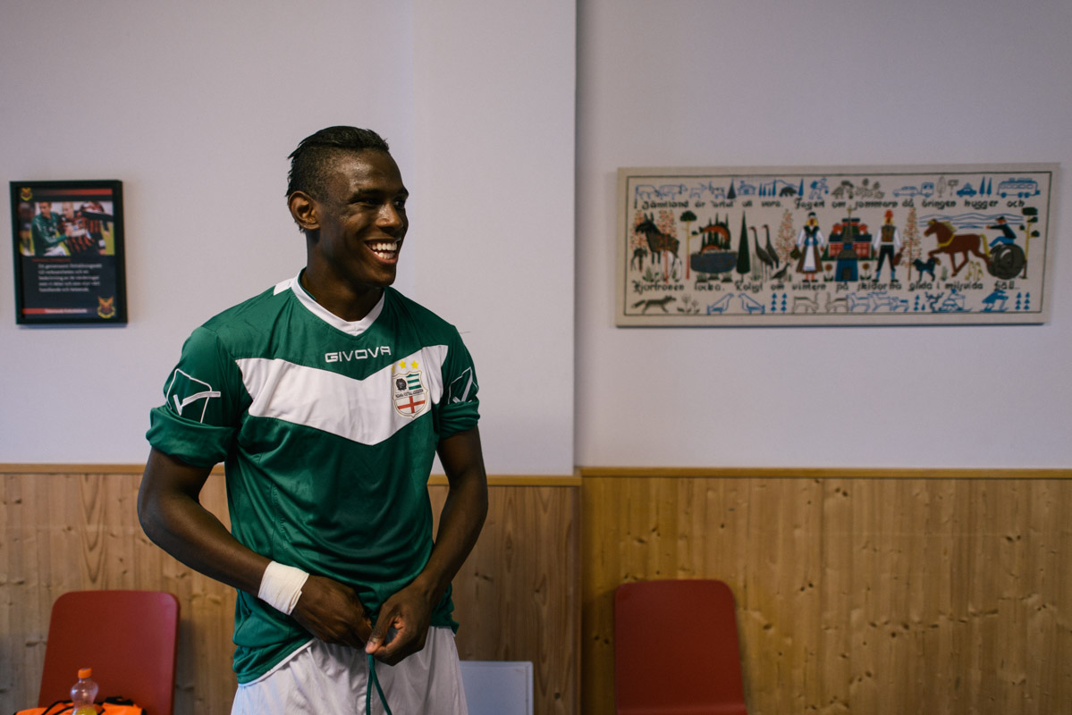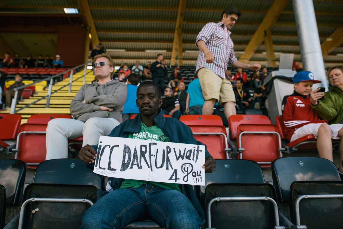 Ismail Abdulrhman, 25, player of Darfur United hold a small banner saying “International Crime Court Darfur is waiting for you”. He hopes to bring back Darfur into the international agenda. During the competition one member of the team, seeing no future back home, decided to hide and went missing in Sweden.